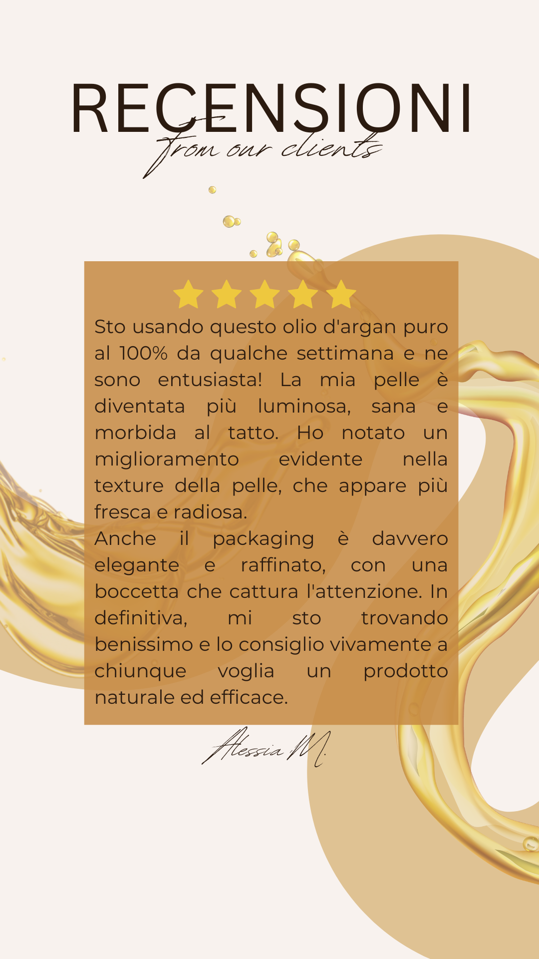 Mi chiamo Francesca e da sempre coltivo una passione per la skincare naturale e per i rituali di bellezza autentici. Ho scelto l’olio di argan perché racchiude in sé tradizione, purezza e benefici concreti per la pelle. Con Argan Éclat ho voluto unire certificazioni internazionali e autenticità, per offrire un prodotto sincero, trasparente e di qualità. Non è solo un olio, ma un gesto quotidiano di cura che porto avanti con dedizione e passione.
